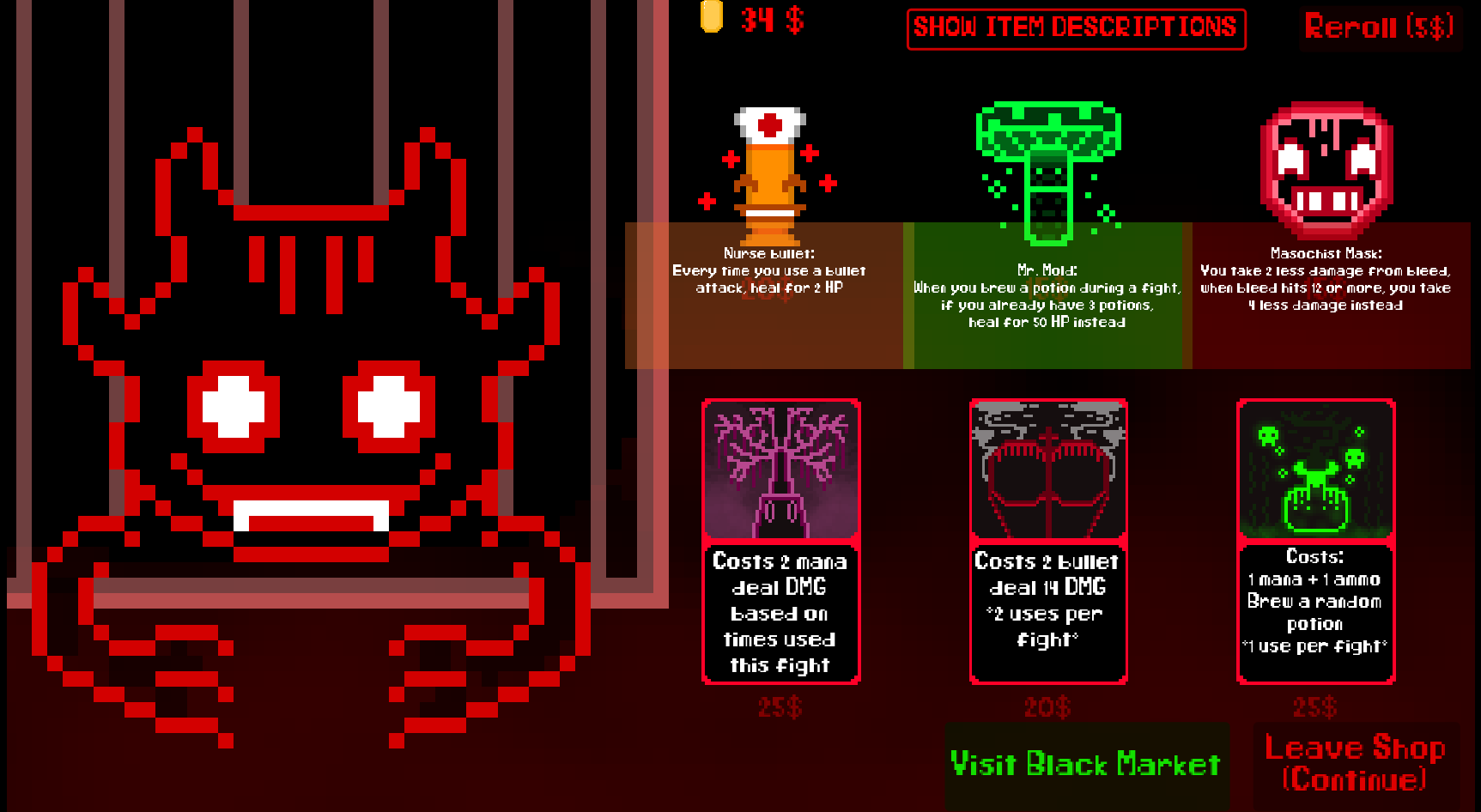 BLACK MARKET: a new sub-section of the shop where you obtain potions and have the option to reduce your max hp for money